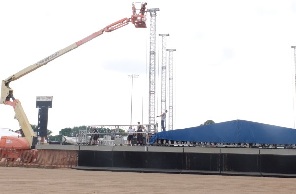 John Finical of TMS (Theatrical Media Service) walks across the “topper” roof that will keep the artists and their bands, plus all the equipment safe from rain. TMS contracts to build the staging structures and lighting for the grandstand acts.