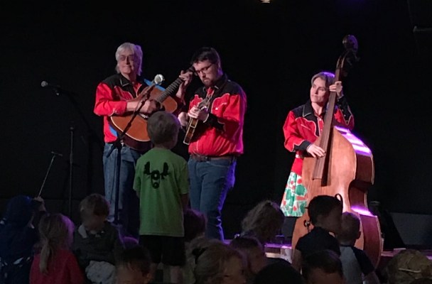 On stage a three piece bluegrass outfit called The Acousticals performs a nice set with a few kid-flavored tunes like Bacon is a Dog’s Best Friend. They look festive in their matching red cowboy shirts and seem happy to play to their lively audience. Several parents have joined their twirling kids on the dance floor.