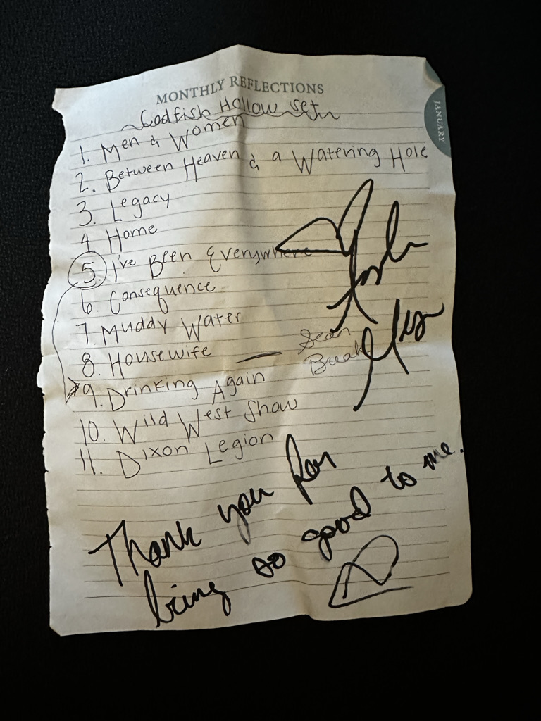 Two memorable moments from last night suggest I earned a spot as one of Angela’s most enthusiastic fans for the evening. The lady next to me leaned over and asked if I was Angela’s mom? ‘Nope, but she’s here!’ I told her. Angela’s nice mom, Christa and her granddad, Eddy, are truly the top fans although I admit it was pretty exciting when Angela passed along her signed setlist to me. That was cool!